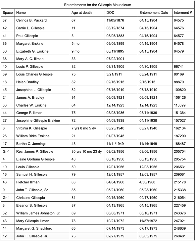 The primary occupant is Louis Charles Gillespie (December 2, 1835 – March 21, 1911). Also interred are Samuel Hazard Gillespie and his wife, Josephine Luce Packard Gillespie. Diana Westcott Paterson holds a complete list of the deceased and the number of available crypts. For more details, contact Diana at dewpaterson@gmail.com.